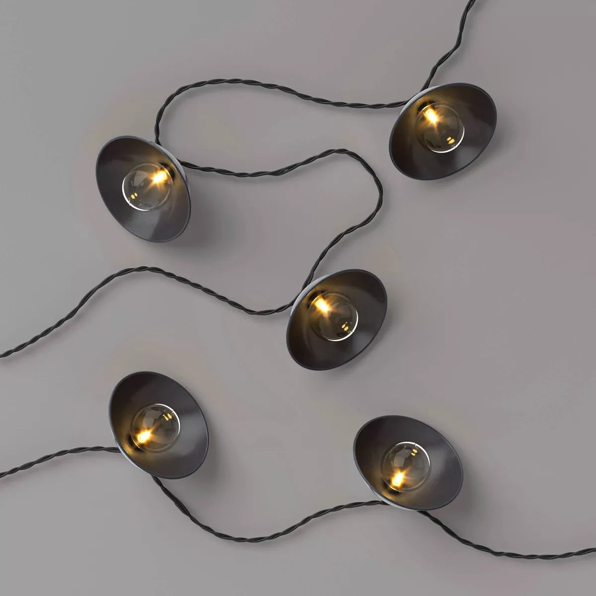 Illuminate your decor with these 10-Count LED Gray Hood Indoor Outdoor Lantern String Lights from Threshold™. Featuring a black plastic cord strung with ten LED bulbs on dark gray hoods, these clear string lights will brighten up the inside or outside of your house with a joyful look. Drape them in your living or dining room or hang them along the edges of your patio or deck to create a warm and welcoming ambiance.