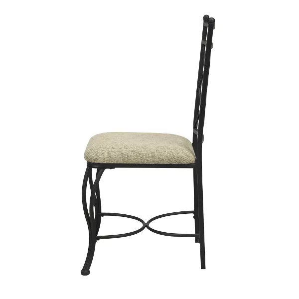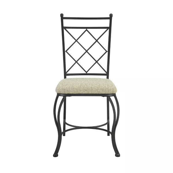 This Dorel Living Chandler Glass Top Metal Dinette is perfect in any home thanks to its traditional style. The elegant metal work and the cross-back chair detail adds a sophisticated look to any home. The Chandlre Glass Top Metal Dinette has plenty of room for the entire family to gather round for dinner or easy entertaining. Set includes four padded upholstered chairs and a beveled glass top dining table. Item ships in 1 box and some assembly is required.