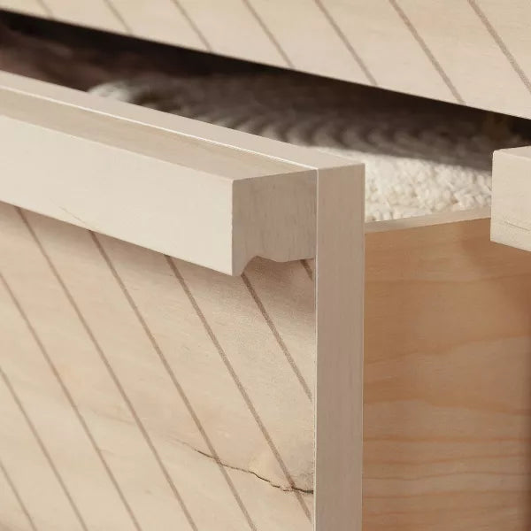 Spacious drawers with metal runners and safety stops hold denim, blouses, and linens.