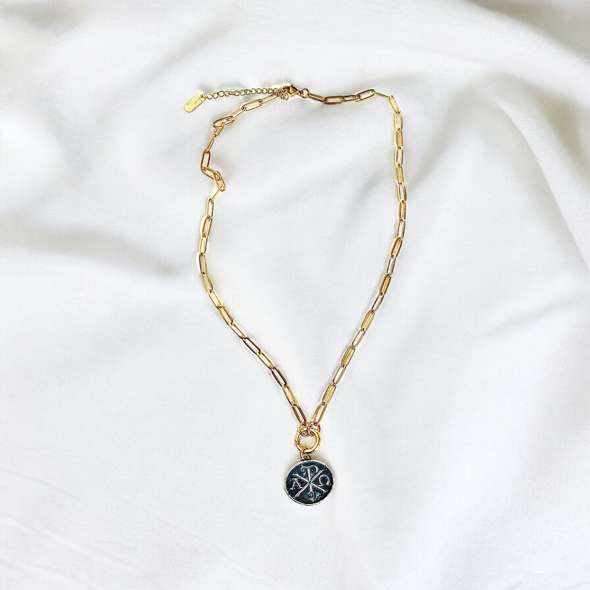 “Alpha and Omega”—a Necklace that cradles eternity. The Chi-Rho Symbol, ancient and sacred, whispers of Christ’s divinity. Its circular embrace encloses the beginning and the end with Christ at the center—the cosmic heartbeat. Inscribed boldly:“I am the Alpha and Omega.”Wear it as a talisman, a reminder that you are part of a grand narrative. From Genesis to Revelation, you are woven into the celestial fabric. Let this symbol rest upon your heart, anchoring you in purpose and promise.