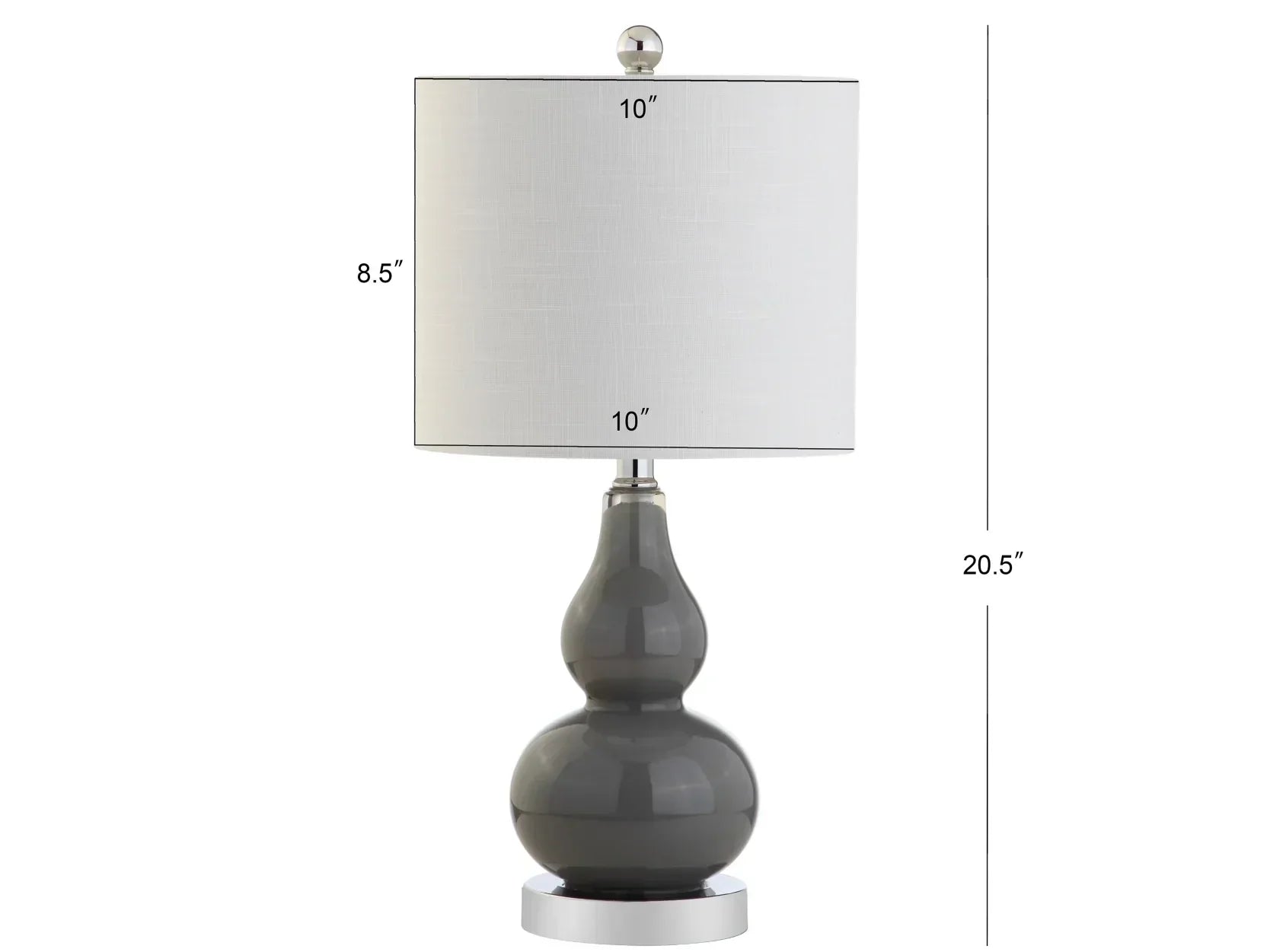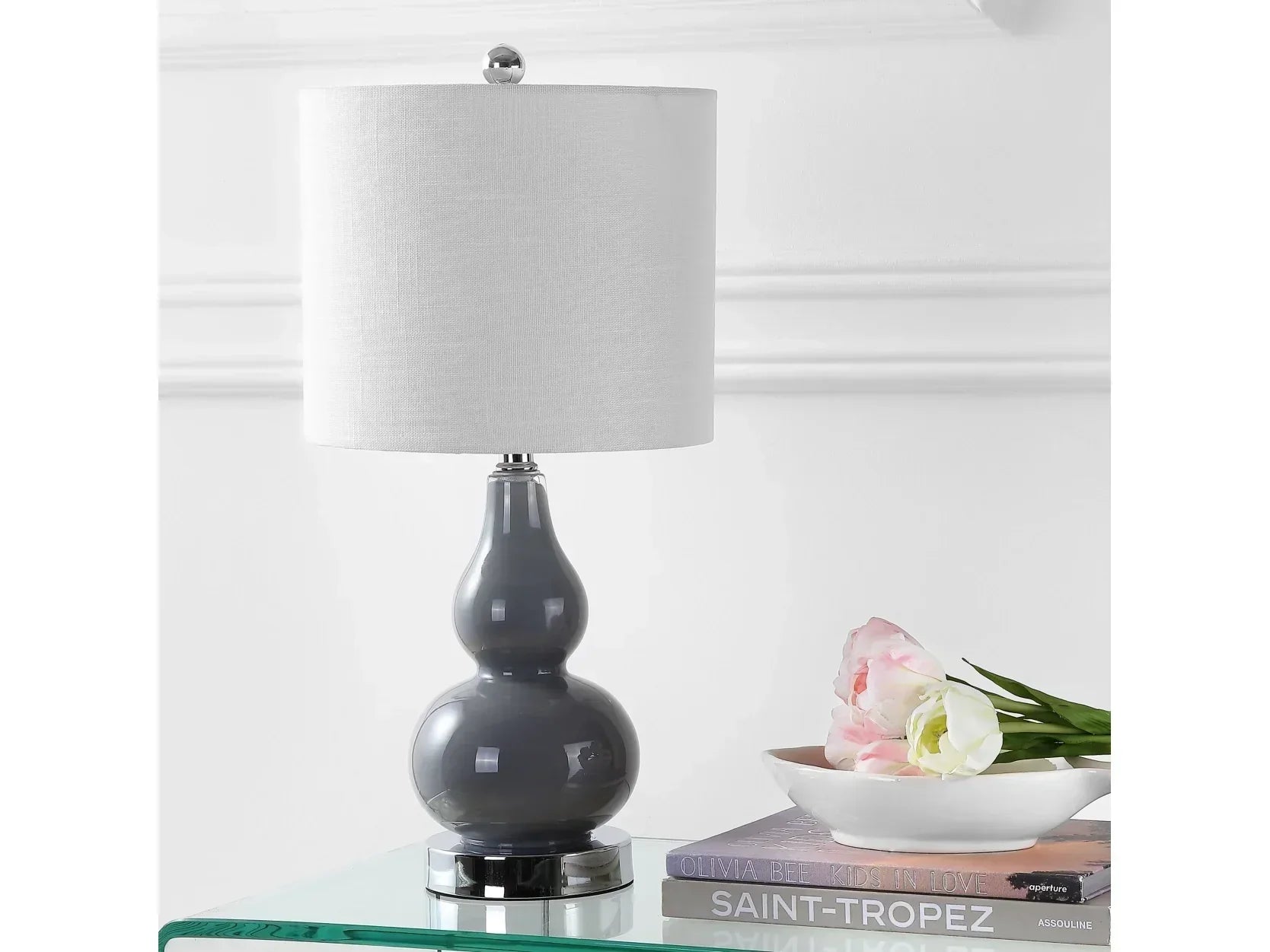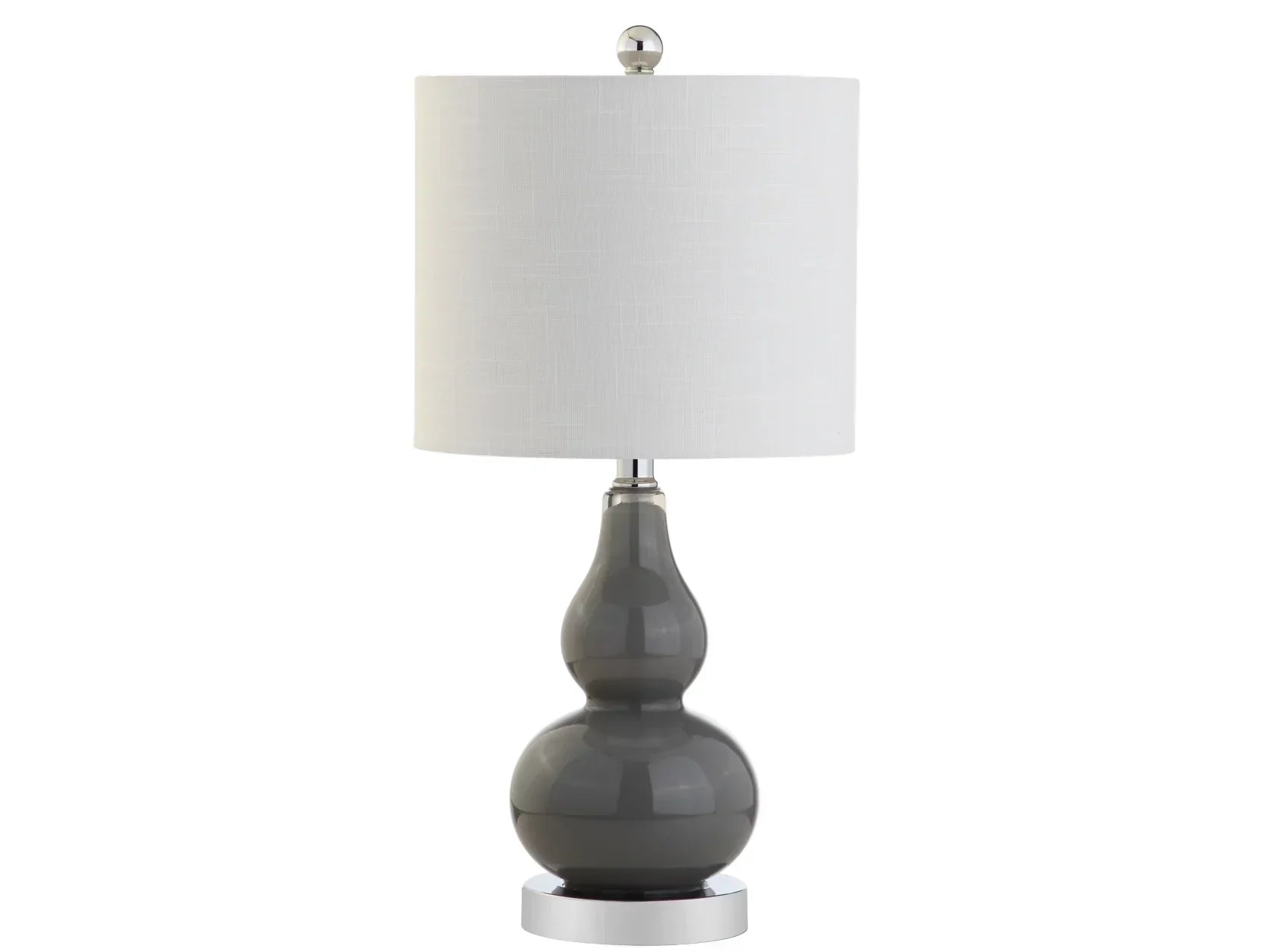 The smaller scale of this classic double-gourd table lamp makes it the perfect fashionable and functional accent for a console table or nightstand. The hand-blown glass body stuns in a gorgeous shade of gray, finished with a chrome-tone base pedestal and matching accents. Up top is a white linen fabric shade and chrome-tone sphere finial. A classic glass lamp with a modern shape, this piece will add both light and style to a variety of rooms.