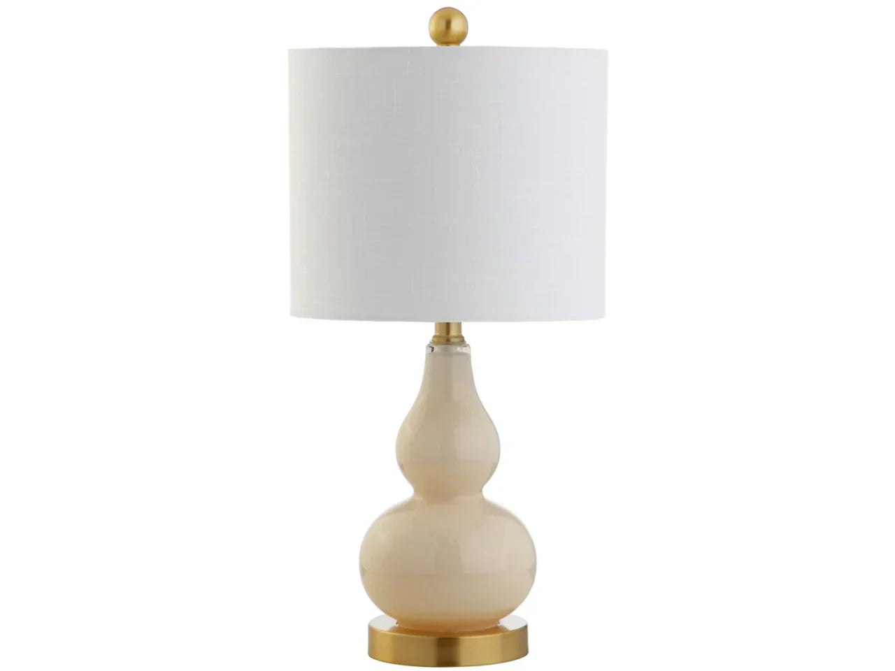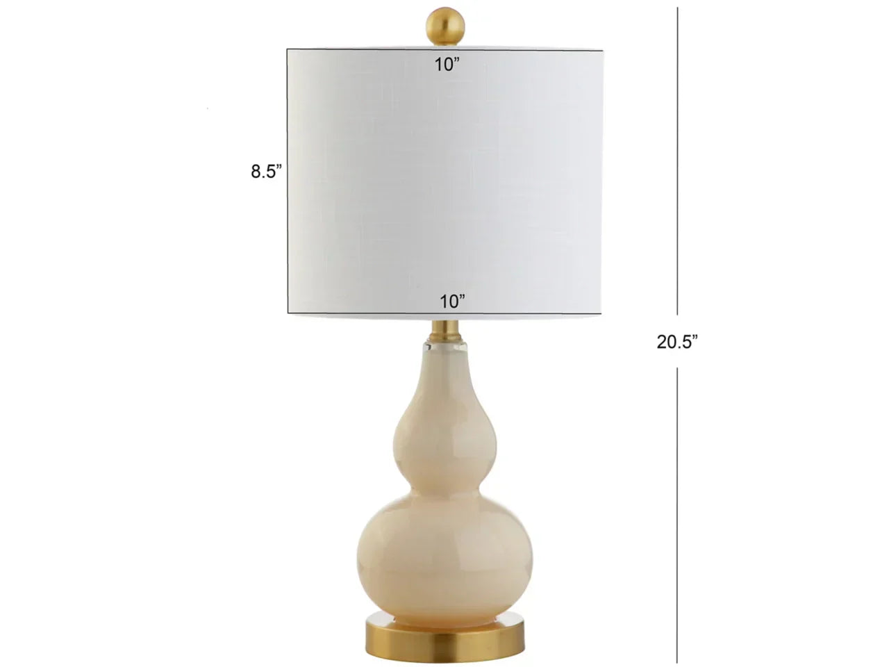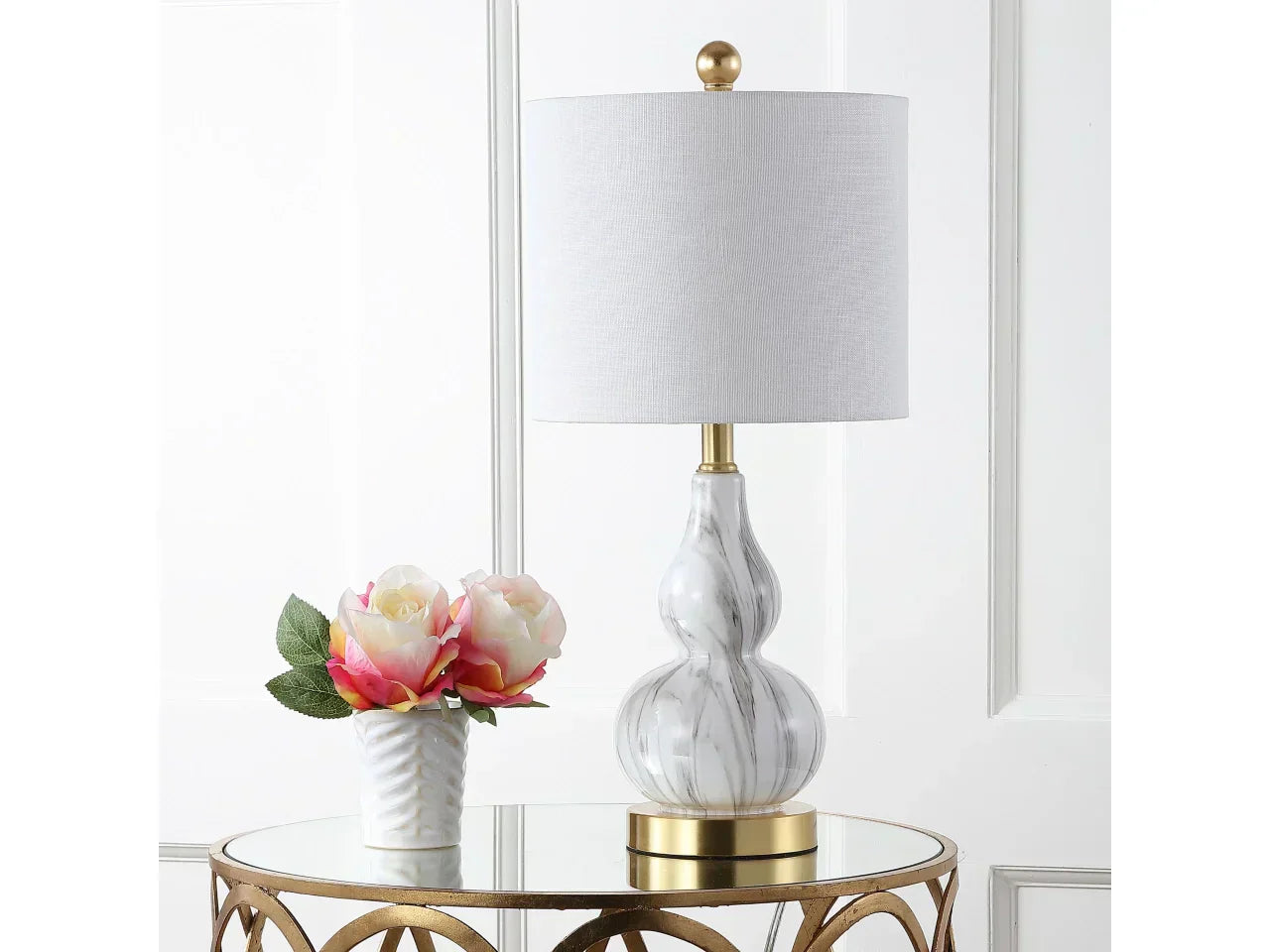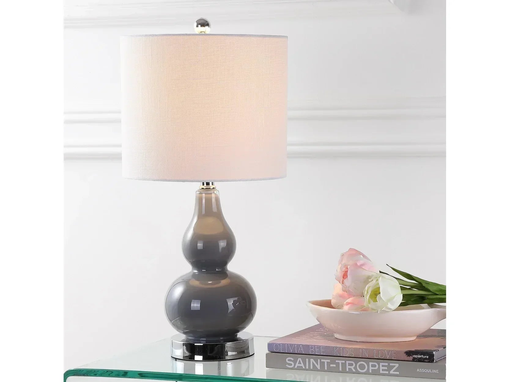 The smaller scale of this classic double-gourd table lamp makes it the perfect fashionable and functional accent for a console table or nightstand. The hand-blown glass body stuns in a gorgeous shade of gray, finished with a chrome-tone base pedestal and matching accents. Up top is a white linen fabric shade and chrome-tone sphere finial. A classic glass lamp with a modern shape, this piece will add both light and style to a variety of rooms.