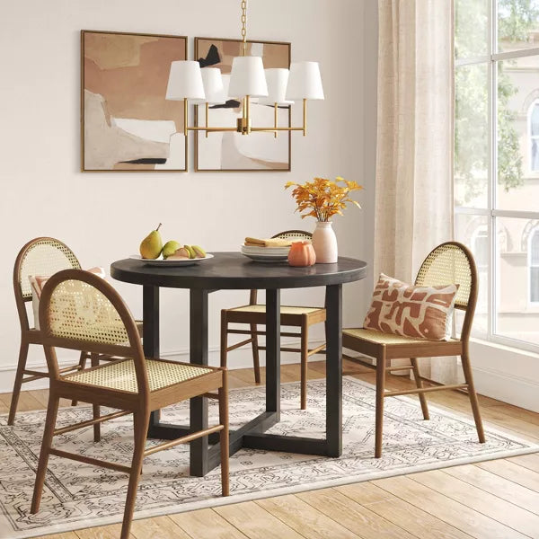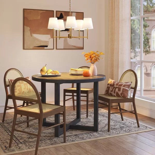 Create a statement look in any space of your home with the 5-Arm Shaded Chandelier from Threshold™. Made with metal, this five-arm chandelier comes with cone-shaped shades for a modern look that complements your existing decor. This metal shaded chandelier drops downs from a long-link chain, and lights up with a one-way light setting.