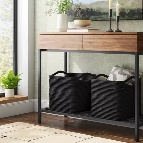 Add artistic flair to your room decor with this Rattan Cube Curve Handle Decorative Basket from Threshold™. Designed in a cube silhouette, this decorative basket features a handcrafted woven rattan construction in black that's sure to complement your modern or rustic decor style. Great for holding small pillows or keeping clutter organized, it's designed with two integrated side handles for easy carrying.