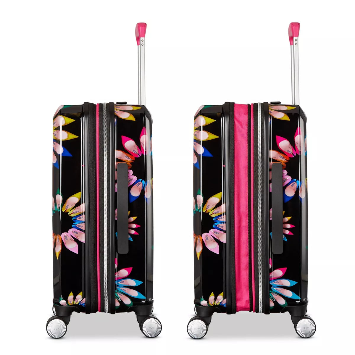 Travel in style with the Sarah Jessica Parker Hardside Expandable Carry-On Spinner Suitcase. Designed for convenience and elegance, this suitcase comes in a sleek Black Shoe Wheel design. It includes two packing cubes and a shoe bag, making organization effortless. Perfect for short trips or weekend getaways, this carry-on offers a blend of sophistication and functionality.