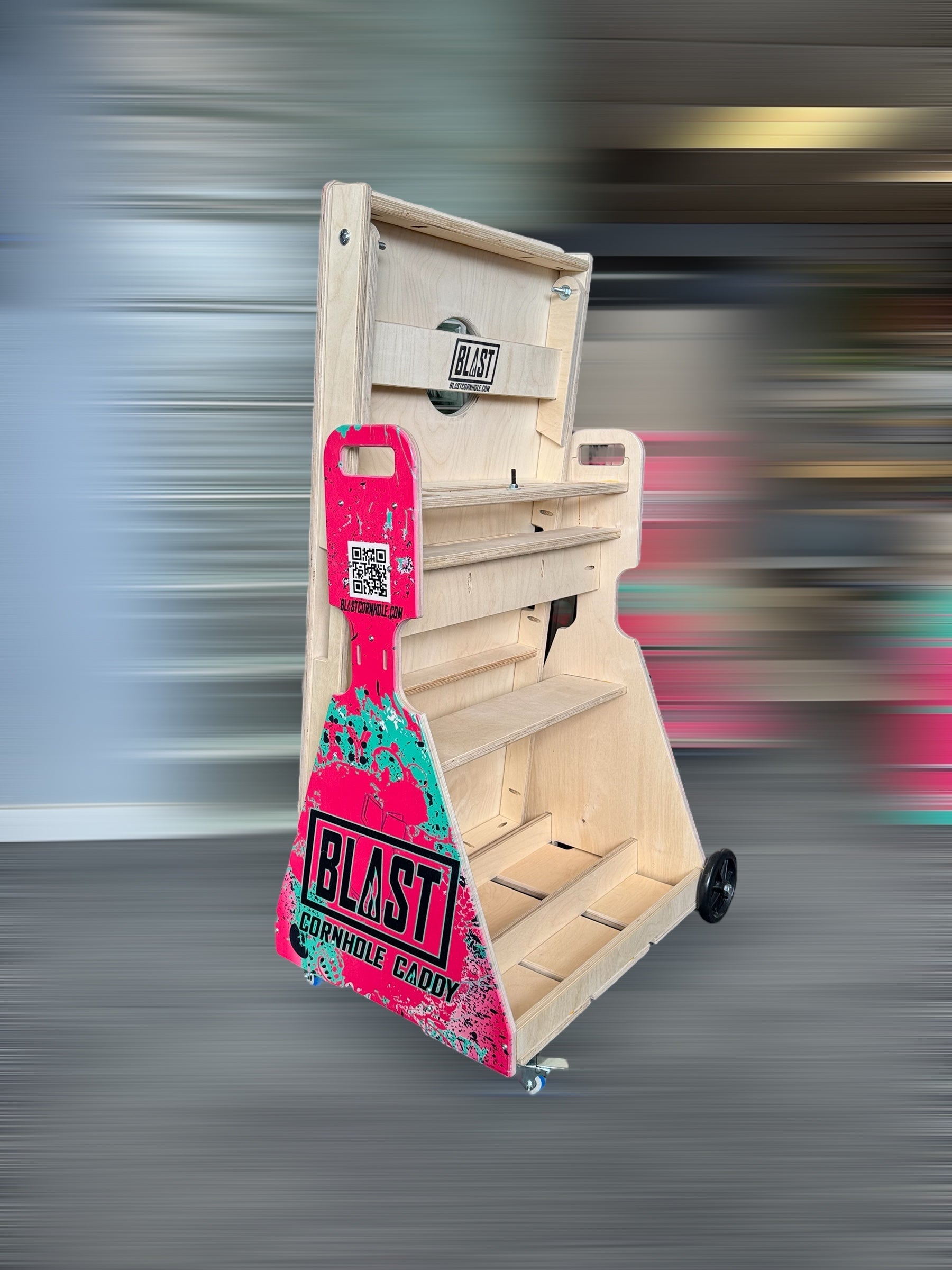 Our Cornhole Caddy not only properly stores and protects your boards by keeping them off the cement so they don’t absorb moisture, but also stores your bags and accessories so all your equipment is in one cart.