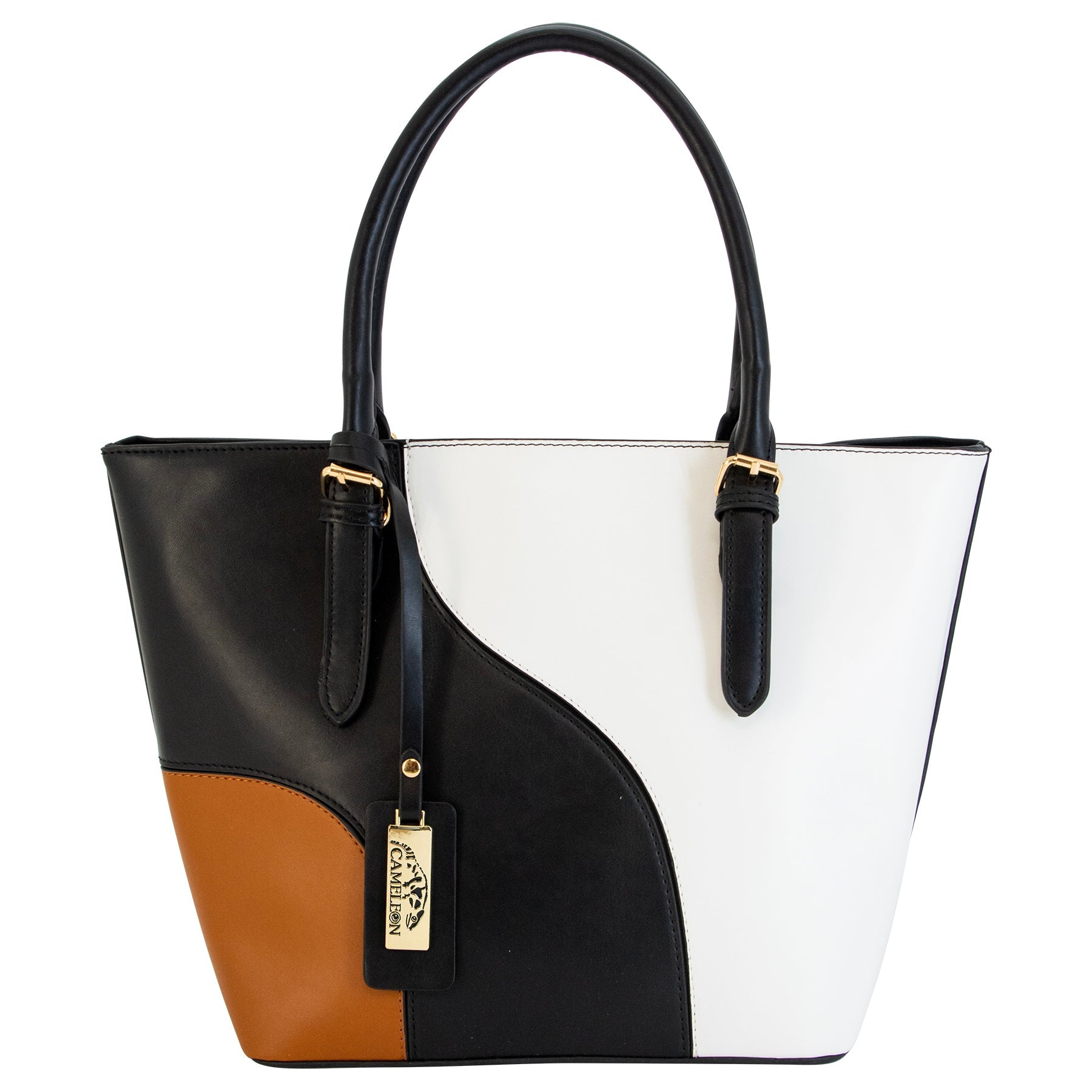 Go straight from the office to dinner with this irresistible top-handle bag, rendered in a sleek black-and-white finish with a small brown highlight touch that turns up the style power of any outsit it is paired with, let this classy piece add structure to flowy silhouettes and be the perfect finishing touch to a monochromatic ensemble.