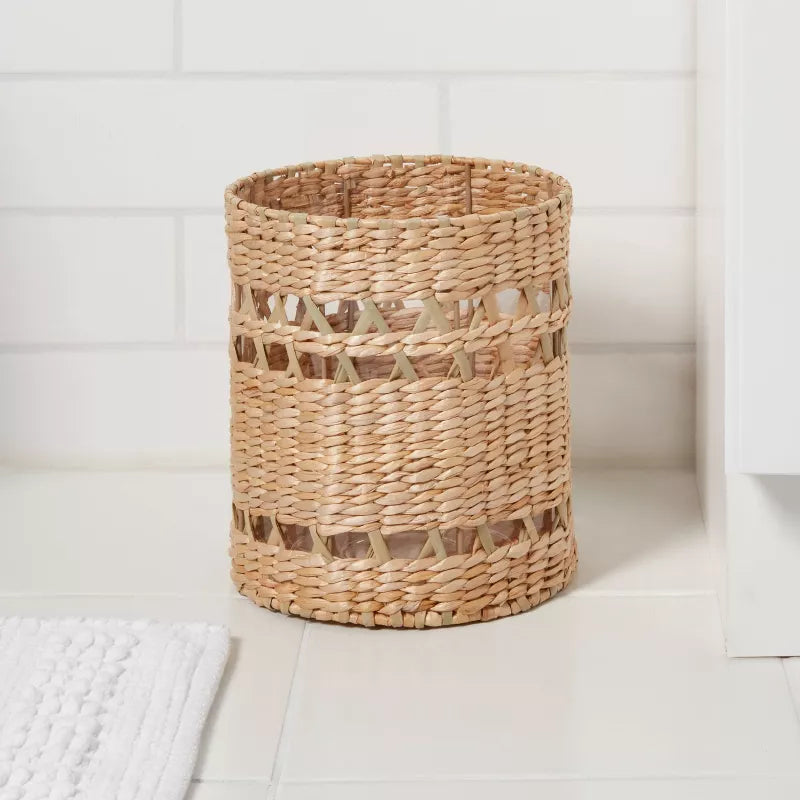 Maintain a clean bathroom space while adding a touch of natural flair with this Woven Waste Can from Threshold™. This natural waste can showcases a beautifully woven pattern with raffia-like accents to lend an artistic flair to your space. Designed in a round shape, this waste can features an open top construction for easy disposal of trash.