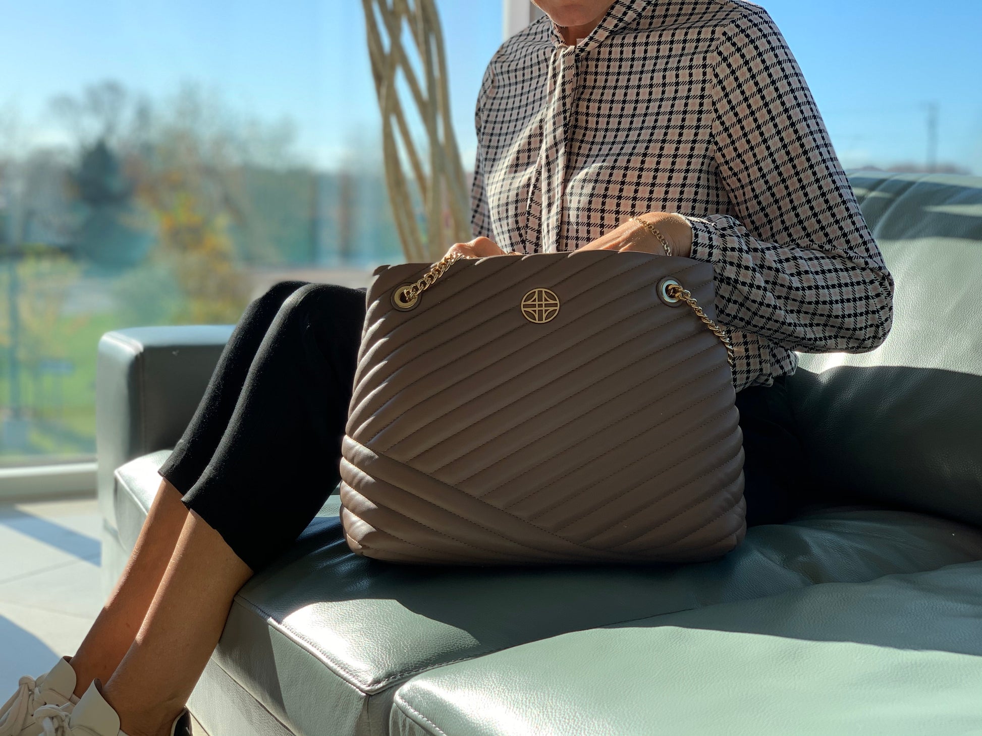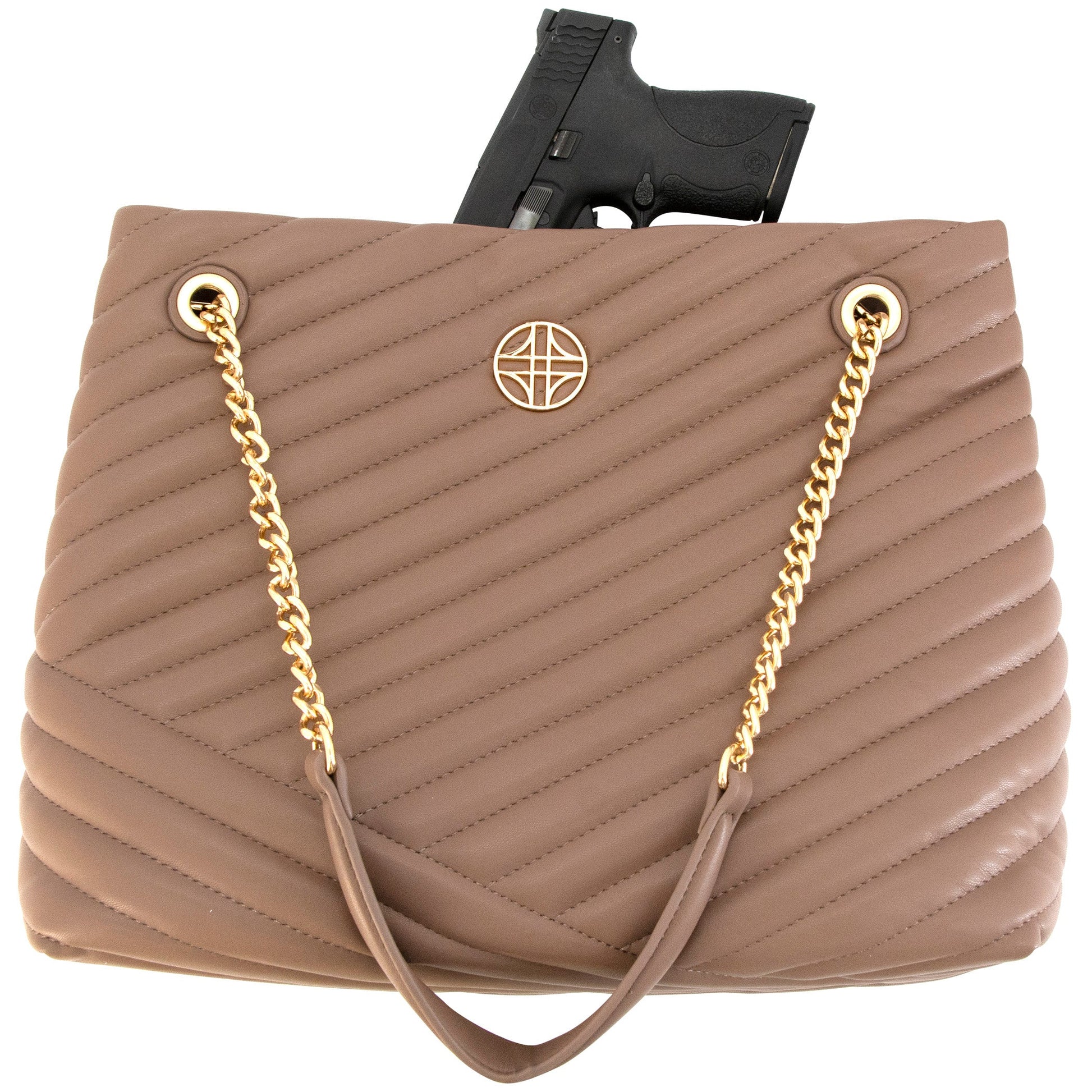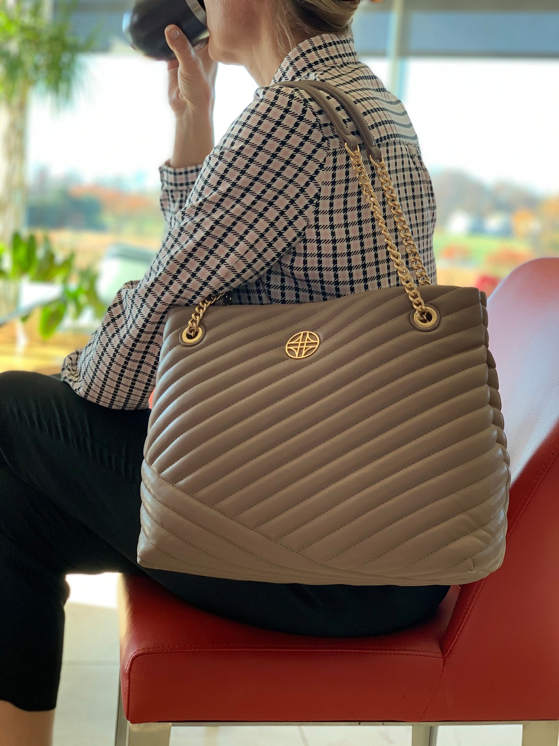 Flora is vegan leather, quilted tote featuring an open-top with snap tab closure and gold medallion detail. It has parallel, vegan leather handled, curb chain straps, and expanding side panels with snaps.