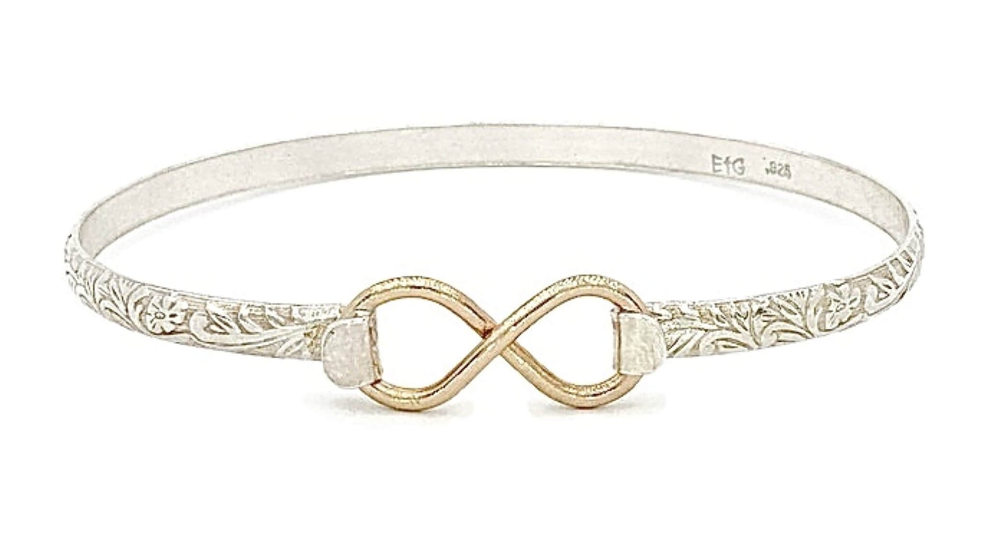 Simple and classic design, our Infinity Bracelet is an understated beauty! Sterling floral pattern wire band and handmade Gold Filled infinity symbol which symbolizes never-ending love! Made in USA.