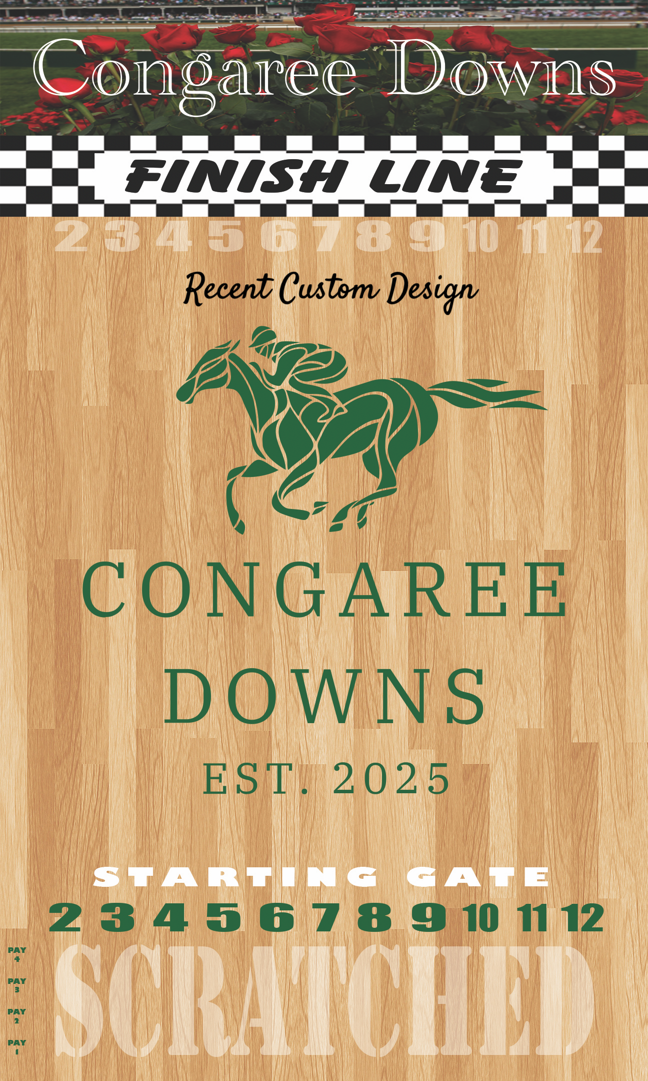 - custom graphics optional including background design, pay outs, drinking spaces, add a name (ie Smith Downs).