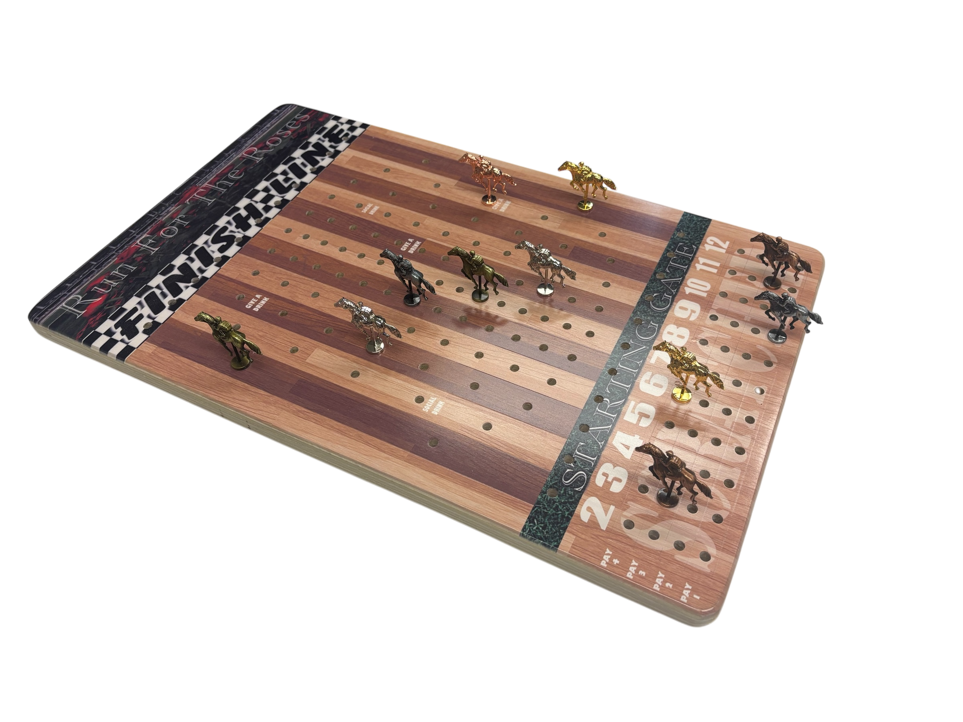Beautiful custom printed (no decal!) on 1” thick Furniture Grade hardwood horse racing game involving dice, cards, gambling, and optional drinking spaces. The night will never end! This game is addicting, so proceed with caution! Have loads of fun with a group of friends and make sure you are in a place where you can get noisy! We make these boards out of high grade 1” furniture grade birch hardwood, CNC cut and engraved, before they are printed on a UV direct printer (right onto the wood surface (no decals or stickers). The design options are unlimited so let your imagination run wild as we can make it a reality with our high-tech equipment and machinery.