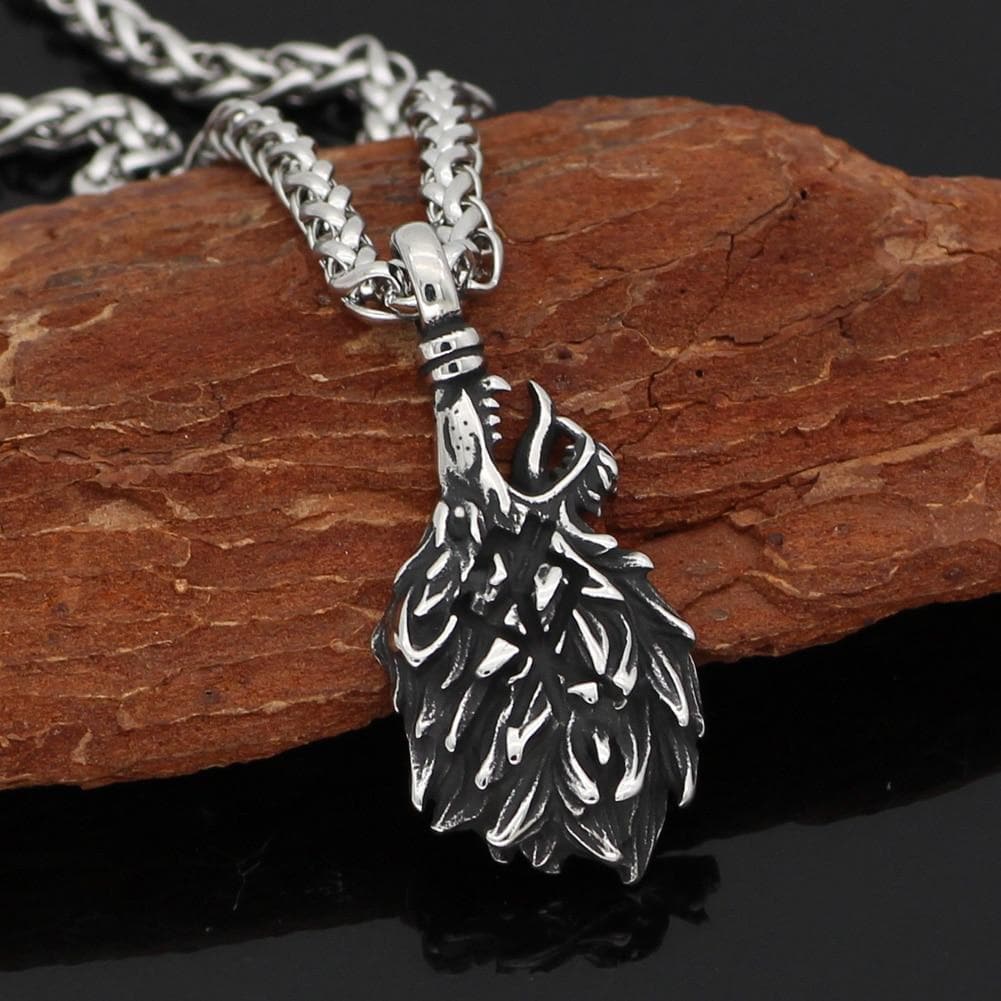 This beautiful Viking Odin Wolf Head Geri & Freki Necklace is made with stainless steel that won't fade or tarnish. This fierce depiction of a wolf in Norse mythology represents loyalty, bravery, and teamwork. In the Norse mythology, Freki and Geri were the two wolves that accompanied Odin and populated the world in their travels with him.
