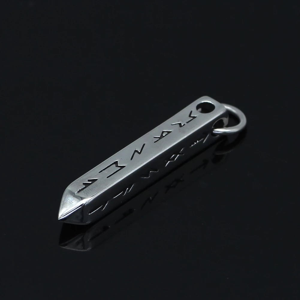 Material: Stainless Steel Symbol: Runes Color: Steel Chain length: 60 cm Chain Type: Snake Chain Pendant Size: 4 cm x 0.6 cm Pendant Weight: 25g